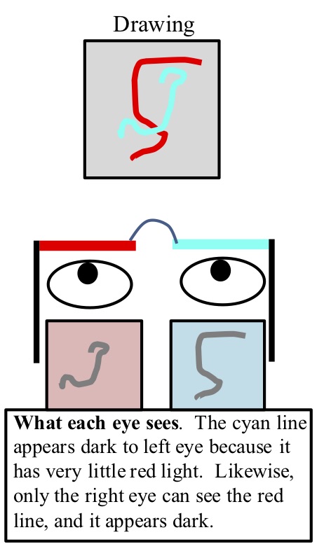 red filter is in front of an observer’s left eye and a cyan (a combination of blue and green) filter is in front of their